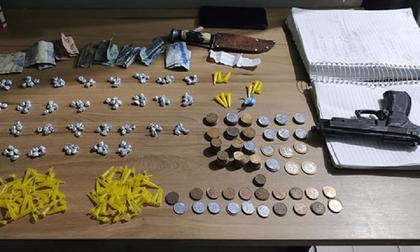 Os policiais conseguiram abordar um dos suspeitos, com o qual foram encontrados cerca de 190 pedras de crack, 10 porções de cocaína, uma quantia em dinheiro, um simulacro de arma de fogo, pinos para armazenar entorpecentes e um caderno com anotações do tráfico.
