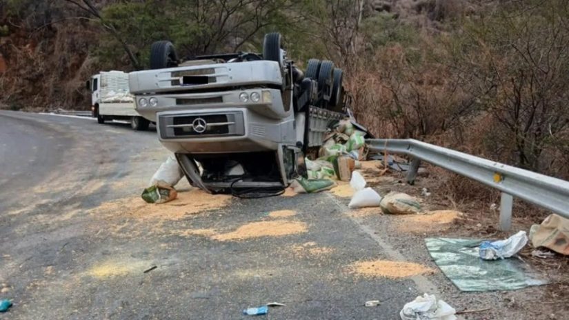 Caminhão carregado com soja e milho tomba na Serra de Teixeira, região de Patos