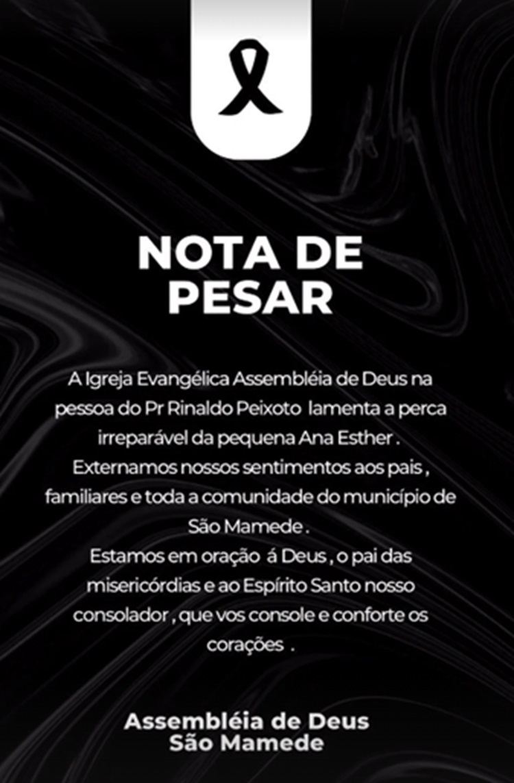 Após o anúncio da morte de Ana Ester, tem sido grande a comoção na cidade de São Mamede. A Câmara Municipal e a Igreja Assembleia de Deus emitiram nota de pesar. Veja abaixo.