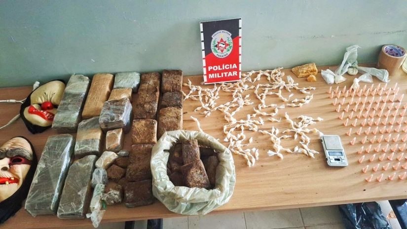 Durante a revista, os policiais encontraram aproximadamente 6,4 kg de maconha em tabletes, 120 pinos de cocaína, 230 papelotes de crack, além de quatro papelotes extras de cocaína e uma pedra de crack pesando 111 gramas. Também foram apreendidas duas garrafas com substância conhecida como “loló”, balança de precisão, materiais utilizados para embalar e consumir drogas, duas máscaras e câmeras de monitoramento.