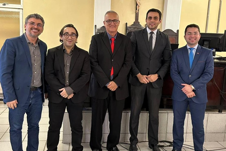 Da esquerda para direita: Ricélio Fernandes – Auxiliar do Poder Judiciário; Wallace Diniz – assistente do Ministério Público; Alexandre Irineu – Promotor; Dr. Hermeson Alves – Magistrado; e Dr. Léo Feitosa – advogado de defesa