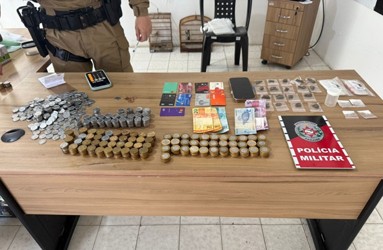 Durante a fuga, um dos suspeitos pulou da garupa da moto e foi alcançado pelos policiais. Com ele, foram encontrados porções de substância semelhante à cocaína e uma quantia em dinheiro, possivelmente proveniente da atividade de tráfico. Diante da situação de flagrante, os policiais retornaram ao imóvel suspeito, onde localizaram mais porções de drogas, dinheiro trocado e um aparelho celular, reforçando as evidências de comercialização de entorpecentes no local.