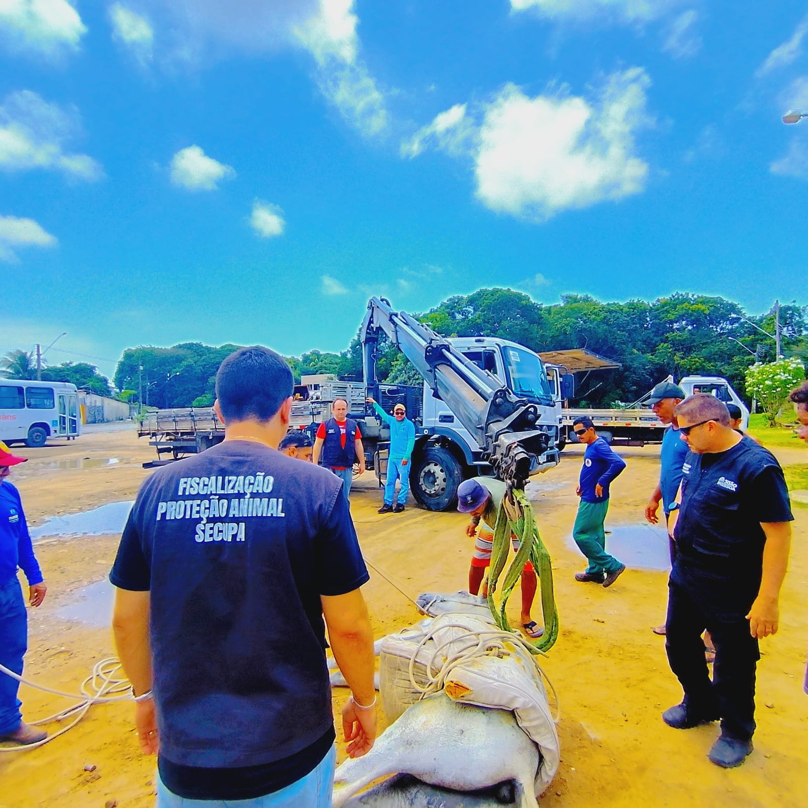 Além da equipe de veterinários da Secretaria de Cuidado e Proteção Animal e funcionários do centro de apreensão, a ação contou com o apoio fundamental de um caminhão munk da Secretaria de Desenvolvimento Urbano (Sedurb)