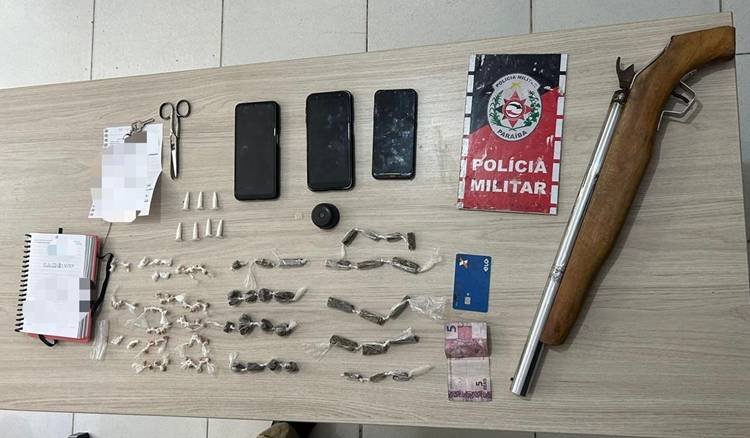 Além das drogas, o material apreendido compreendeu uma arma artesanal de calibre 12, aparelhos celulares e um caderno contendo anotações e material de contabilidade que indicam a movimentação do tráfico na região.