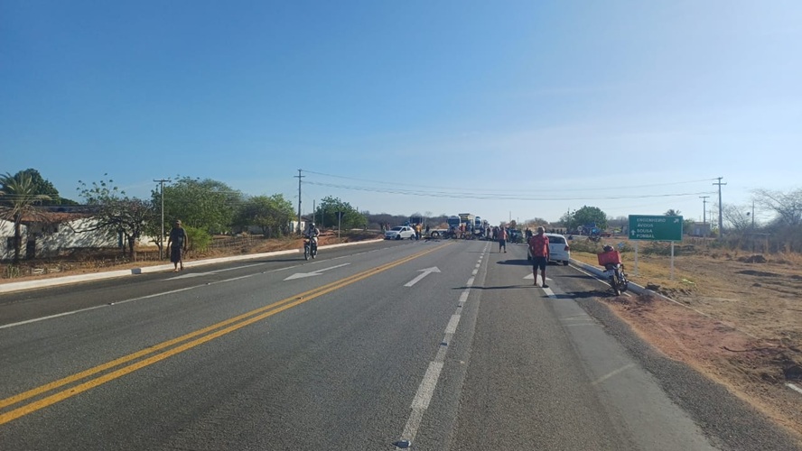 O bloqueio acontece nos dois sentidos da rodovia em decorrência de um protesto realizado por ribeirinhos, agricultores e pescadores afetados pela crise hídrica no Açude Engenheiro Avidos (Boqueirão de Piranhas).