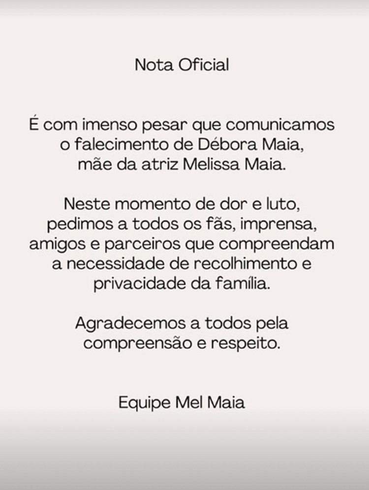 No momento, as autoridades investigam as circunstâncias do falecimento, e não há decisão oficial sobre causa da morte. A família solicitou que evitem especulações enquanto aguardam resultados. Veja abaixo a nota emitida pela assessoria de Mel Maia: