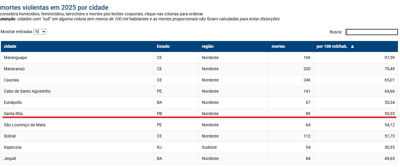 Santa Rita, na região metropolitana de João Pessoa, foi a 6ª cidade com a maior quantidade de mortes violentos por 100 mil habitantes em 2025, de acordo com os Dados Nacionais de Segurança Pública enviados pelos Estados ao Ministério da Justiça e Segurança Pública.
