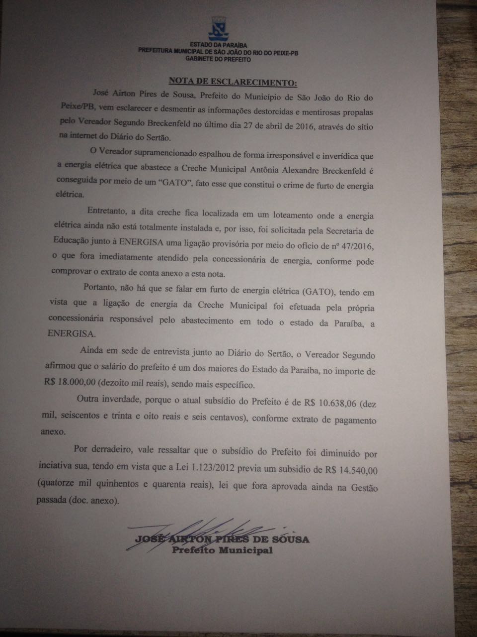 O prefeito de São João do Rio do Peixe, Airton Pires (PSC) respondeu nesta sexta-feira (29), a denúncia do vereador do município, o líder da oposição Segundo Breckenfeld (PTB). De acordo com o oposicionista, a atual gestão colocou um “gato” nas instalações elétricas de uma creche municipal recém-inaugurada.