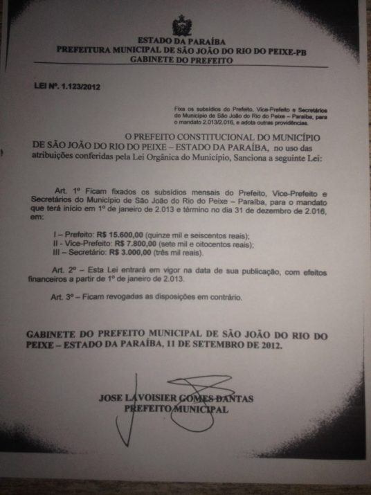 Na nota, o prefeito se reportou também quanto a denúncia de que seu salário seria um dos maiores do estado, em torno de R$18 mil, e informou que o salário de prefeito é fruto e um aumento do ex-gestor, Lavoisier Dantas (PP), no ano de 2013, que teve uma elevação para R$ 15,600, porém, após assumir o cargo, reduziu para a importância de R$ 10.638,06, salário atual.
