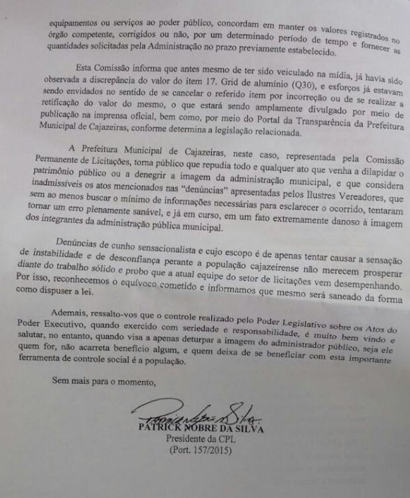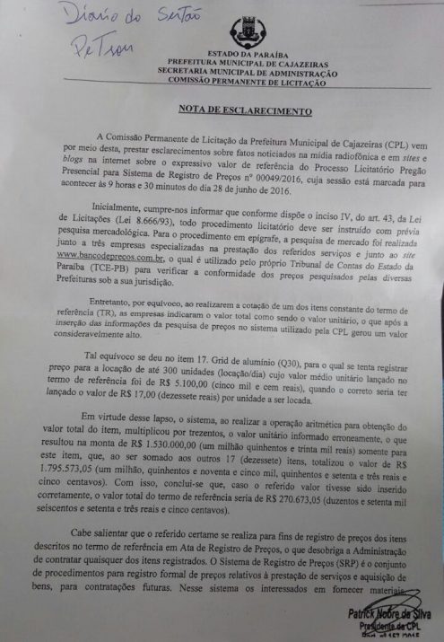 A prefeitura de Cajazeiras, através da Comissão de Licitação encaminhou Nota à Imprensa nesta quarta-feira (22), para esclarecer a denúncia do vereador Alysson Lira (Neguim do Mondrian-PSD), sobre uma licitação de quase R$ 2 milhões para locação de tenda, palco, som, iluminação, luz, gerador, banheiro químico, grade de contenção, carros de sons e afins.