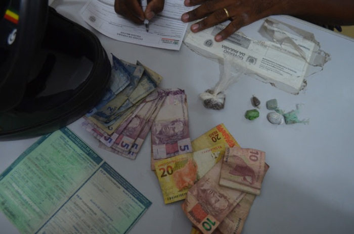 No local foi encontrado dois capacetes usados na ação criminosa, além de dinheiro e várias pedras de uma substância semelhante a maconha.