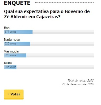 A enquete que foi ao ar em 27 de dezembro de 2016, obteve 2.104 cliques, que ficaram entre bom e ruim a expectativa do governo de Zé Aldemir em Cajazeiras.