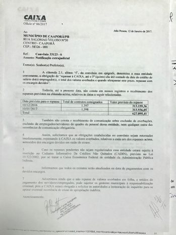 O prefeito de Caaporã, Kiko Monteiro (PDT), notificado pela Caixa Econômica Federal (CEF), devido ao não repasse de verbas pela gestão anterior, anunciou nesta terça-feira (16), que pretende acionar o Ministério Público e a Polícia Federal para investigar o desvio das verbas federais e responsabilizar os verdadeiros culpados por diversos desmandos praticados durante a antiga gestão do município localizado no Litoral Sul paraibano.
