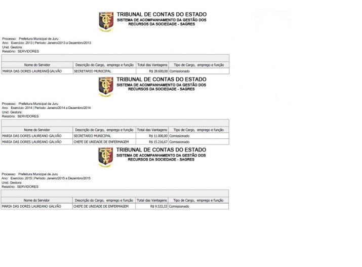 Dados do TCE mostram valores recebidos pela primeira-dama na ordem de R$ 75 mil, entre salários e diárias. O curioso é que nos documentos do Tribunal de Contas do Estado, a mulher do prefeito aparece como secretária e como chefe de unidade de enfermagem.