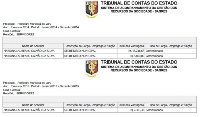 A jovem Mariana Galvão, filha do prefeito aparece no TCE entre os anos de 2014 e 2015 recebendo como secretária do município, e teria recebido dos cofres públicos R$ 26.400 mil, entretanto, nesse mesmo período ela morava e estuda fora do município, de acordo com a denúncia.