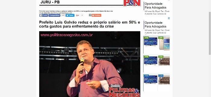 O prefeito reeleito de Juru, no Sertão do estado, Luiz Galvão da Silva (PSB), passou sua campanha propagando redução nos gastos públicos devido a crise, mas segundo dados do Tribunal de Contas do Estado, o discurso e a prática andam longe na cidade paraibana. A informação é de um cidadão de Juru, que disse não querer se identificar por temer represálias.