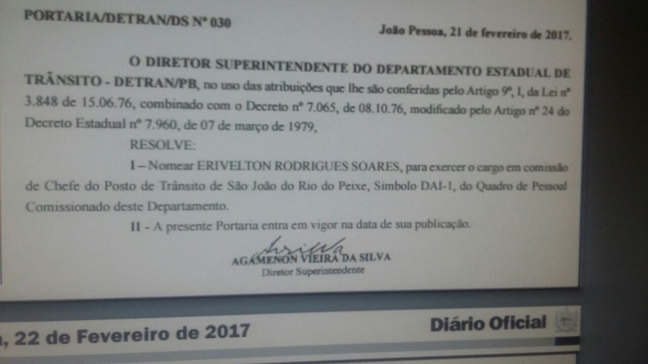 O Diário Oficial do Estado da Paraíba, na sua edição online dessa terça-feira (21) trouxe a nomeação para a nova diretoria do posto do Detran em São João do Rio do Peixe.