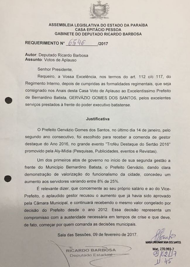 A Assembleia legislativa da Paraíba aprovou matéria apresentada pelo Deputado Ricardo Barbosa que solicitou da casa legislativa que fosse consignada nos anais da Casa votos de aplausos ao Prefeito de Bernardino Batista Gervázio Gomes (PSB).