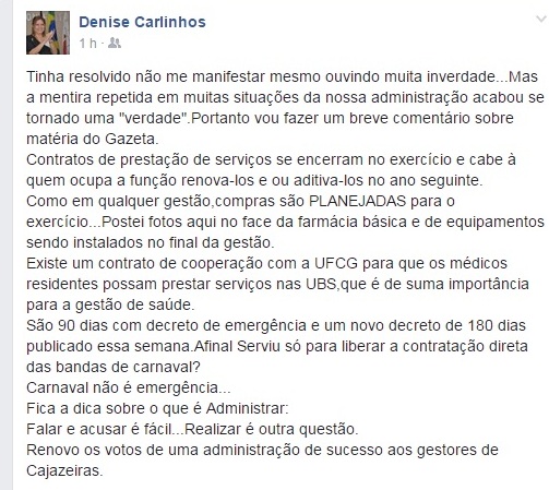 A ex-prefeita de Cajazeiras, Denise Albuquerque (PSB) usou sua rede social Facebook nesta sexta-feira (31), para alfinetar a administração do seu ex-aliado, o prefeito Zé Aldemir (PP).