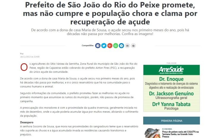 Nossa reportagem tentou entrar em contato com o órgão competente da prefeitura de São João do Rio do Peixe, mas não obteve retorno, deixando aqui o espaço aberto para a edilidade.