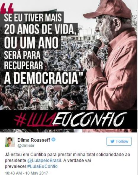 “Já estou em Curitiba para prestar minha total solidariedade ao presidente Lula. A verdade vai prevalecer. #LulaEuConfio”, escreveu a ex-presidente em sua conta no Twitter.