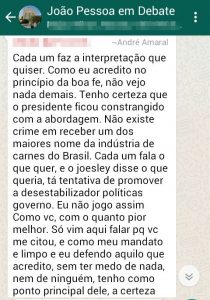 A ‘briga’ foi iniciada após o parlamentar usar o aplicativo de mensagem defender o presidente Michel Temer (PMDB), que amarga uma posição complicada após a delação da JBS. “Tenho certeza que o presidente foi constrangido com a abordagem”, escreveu Amaral se referindo a conversa gravada entre Temer o empresário Joesley Batista.