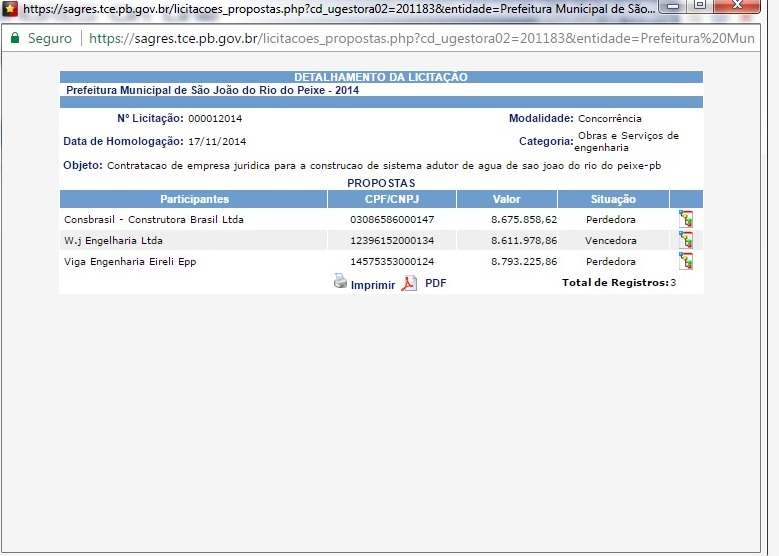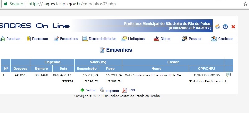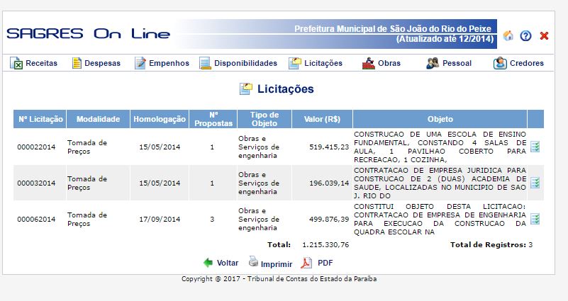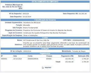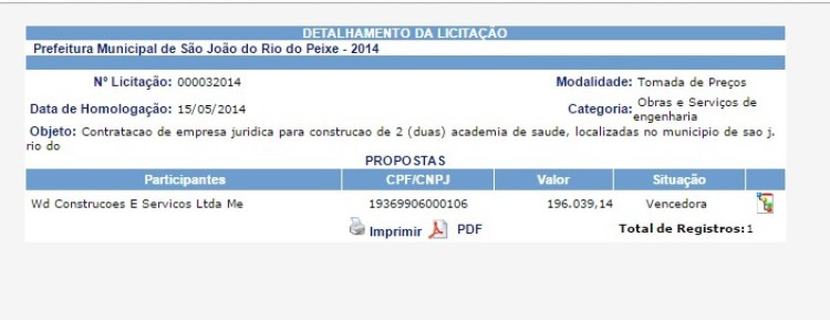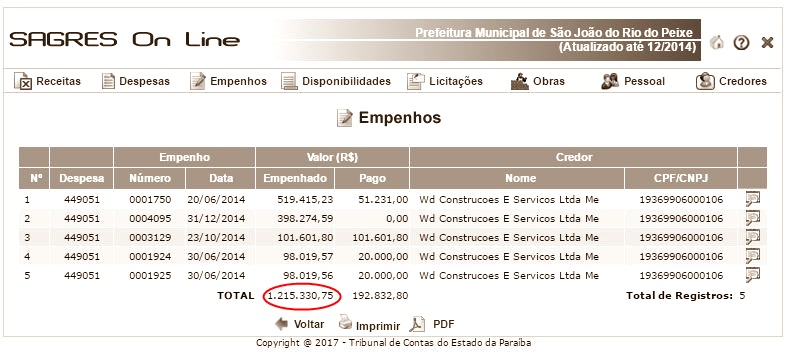 Somente no ano de 2014, a prefeitura de São João do Rio do Peixe empenhou R$ 1.215.330,75 para a Wd. Construções e Serviços Ltda Me.