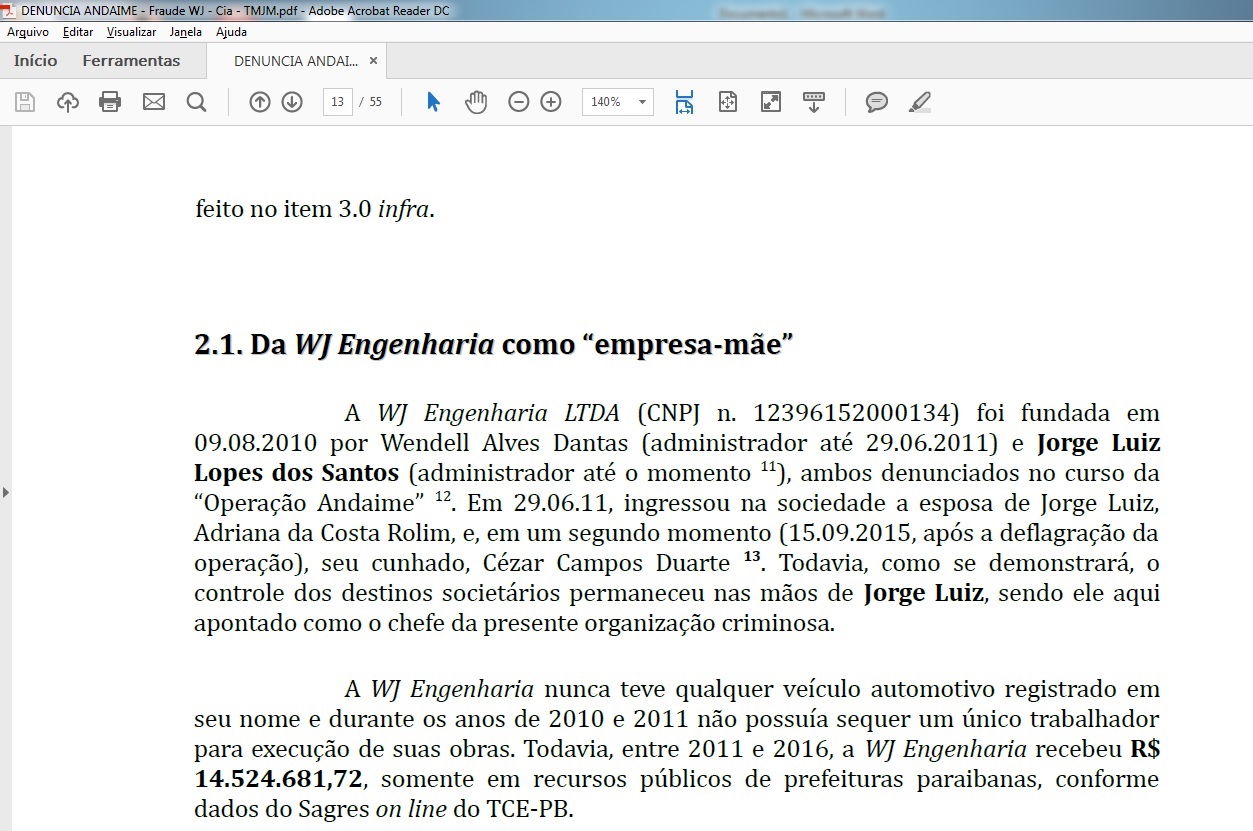 “A WJ Engenharia não possui sequer um único trabalhador para execução de suas obras”, diz trecho da denúncia do MPF.