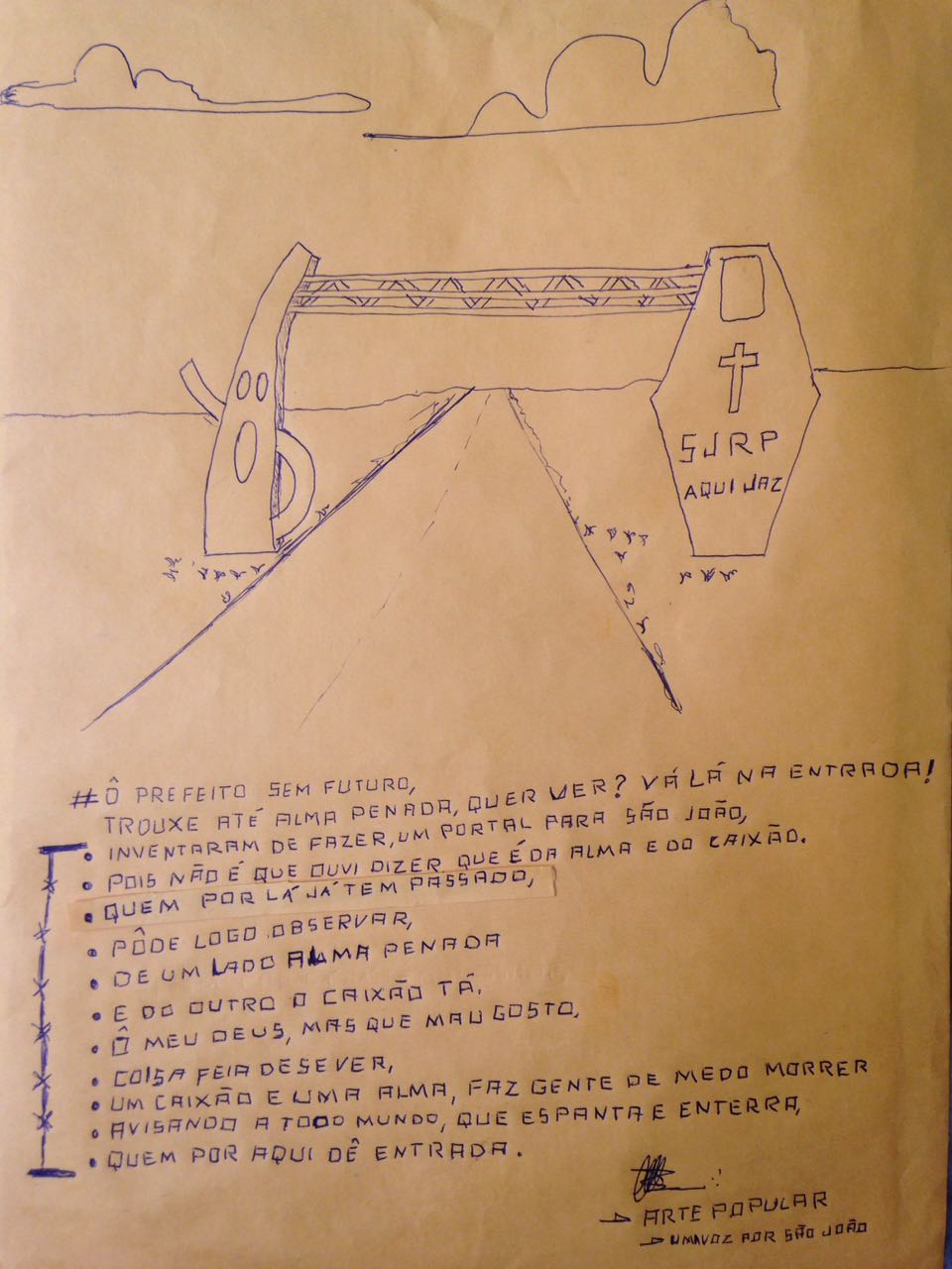 Nas redes sociais e aplicativos de mensagens, um desenho e um poema intitulados de “Arte Popular. Uma Voz Por São João” faz uma comparação da obra. “Um caixão e uma alma, faz gente de medo morrer, avisando a todo mundo que espanta e enterra, quem por aqui dê entrada”, diz um trecho do texto divulgado nas redes sociais.