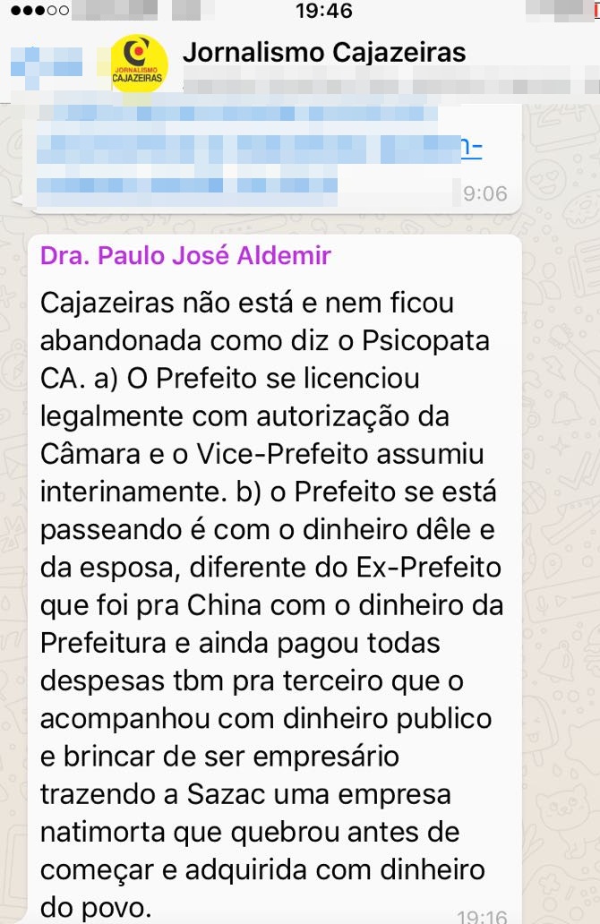 Não satisfeita, nessa segunda-feira, a primeira-dama usou o grupo “Jornalismo Cajazeiras”, do aplicativo de mensagem Whatsapp, para dá a resposta sobre o suposto abandono da cidade e detonou Carlos Antonio: “Cajazeiras não ficou nem está abandonada como diz o Psicopata CA”.