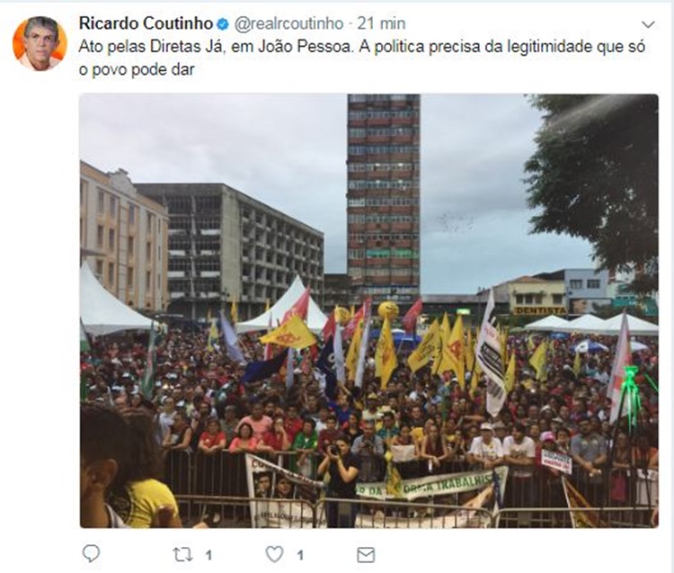 Ricardo usou sua conta no twitter para expressar a relevância da mobilização e a importância da manifestação do povo. “Ato pelas Diretas Já, em João Pessoa. A política precisa da legitimidade que só o povo pode dar”, publicou.