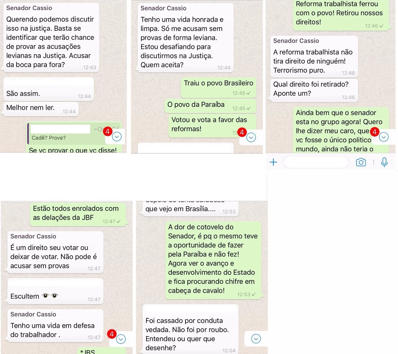 Os participantes do grupo discutiam sobre a situação do município de Uiraúna, quando uma pessoa supostamente ligada a Cássio fez elogios ao senador. Nesse momento, Daniel, que também é proprietário do portal de notícias Nordeste 247, rebateu e disse que o tucano “traiu o povo paraibano” ao votar a favor das reformas propostas pelo presidente Michel Temer (PMDB).