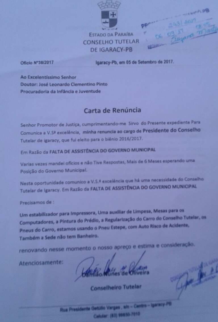 O Presidente do Conselho Tutelar da cidade de Igaracy, no Sertão da Paraíba, o locutor Damião Nunes renunciou o cargo esta semana alegando falta de assistência da prefeitura. De acordo com o próprio presidente, vários ofícios foram encaminhados ao prefeito José Carneiro Almeida da Silva (Lídio Carneiro – PTB), dando conta da falta de equipamentos, estrutura do prédio e até material de expediente. O Conselho é formado por cinco membros, eleitos pela população, entre eles é escolhido o presidente, com mandato de dois anos.