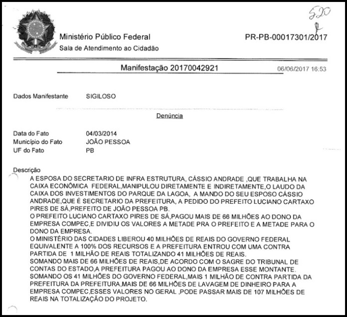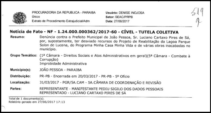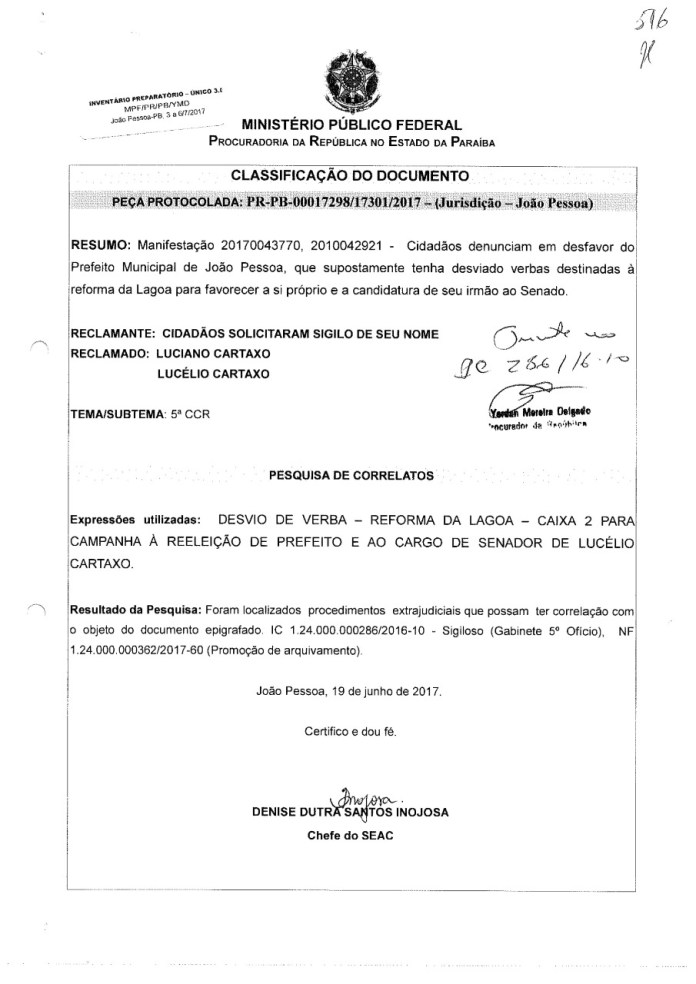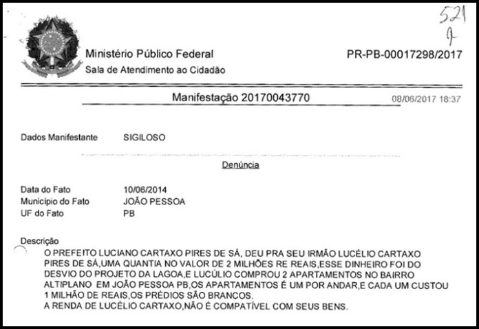 Em documento postado na matéria do noticioso diz que o suposto desvio de verba pública teria a finalidade de caixa 2 para financiar a campanha de Lucélio para senador em 2014 e reeleger de Cartaxo em 2016.