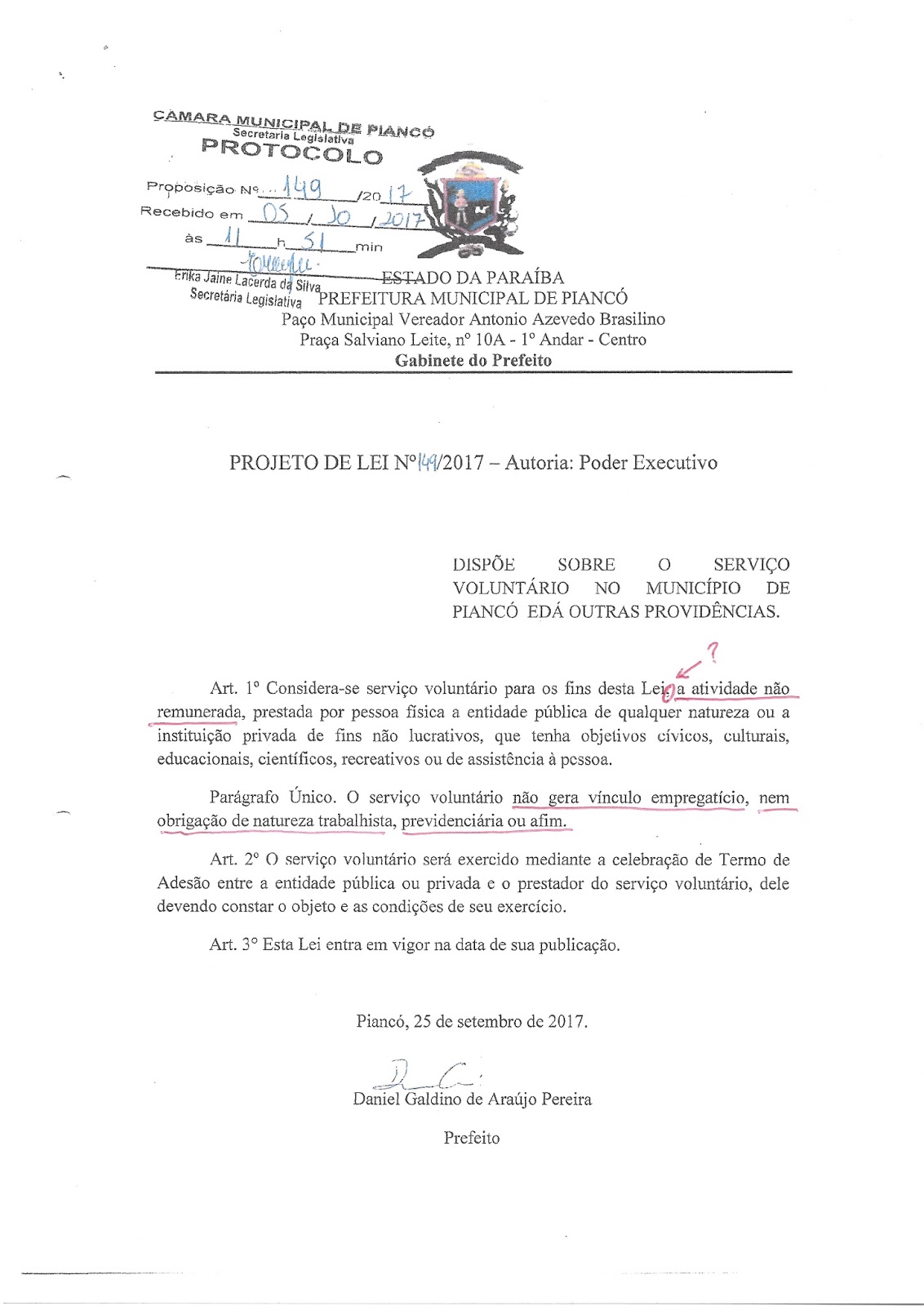 Em um trecho do projeto do Executivo de Piancó é deixado claro que o “Serviço Voluntário” não gera vínculos empregatícios, e é feito por termo de adesão do interessado.