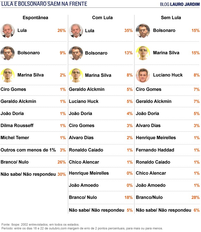Quando o Ibope não apresenta ao entrevistado uma cartela com os nomes, ou seja, a citação sobre o candidato é espontânea, Lula aparece com 26% das intenções de voto (no Nordeste tem 42%) e Bolsonaro com 9%.
