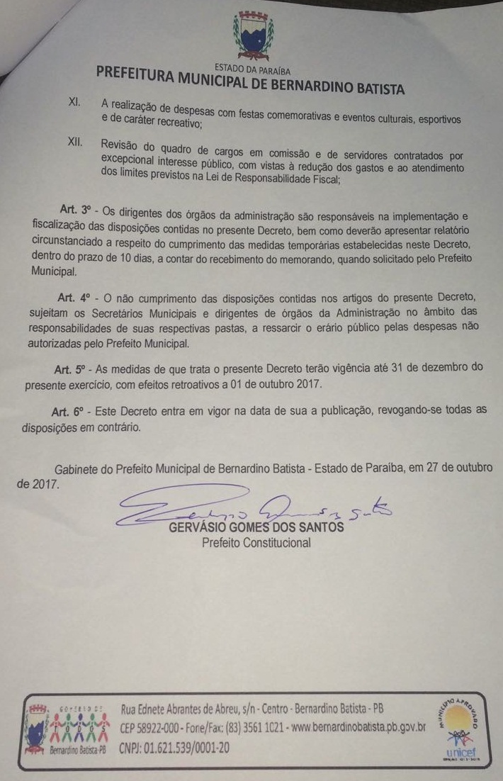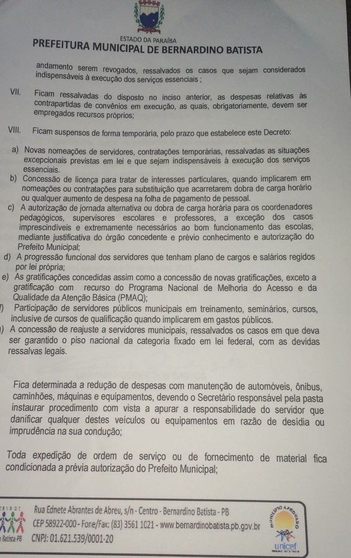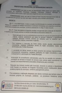 Por Decreto, prefeito de Bernardino Batista suspende gratificações e cancela ‘Festa do Caju’
