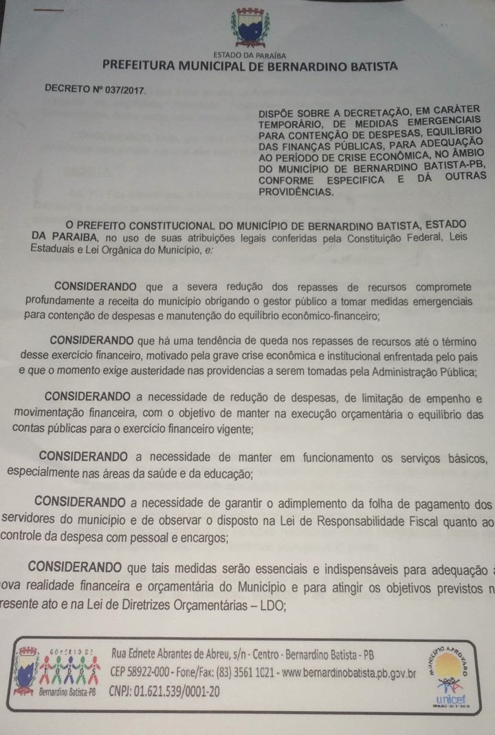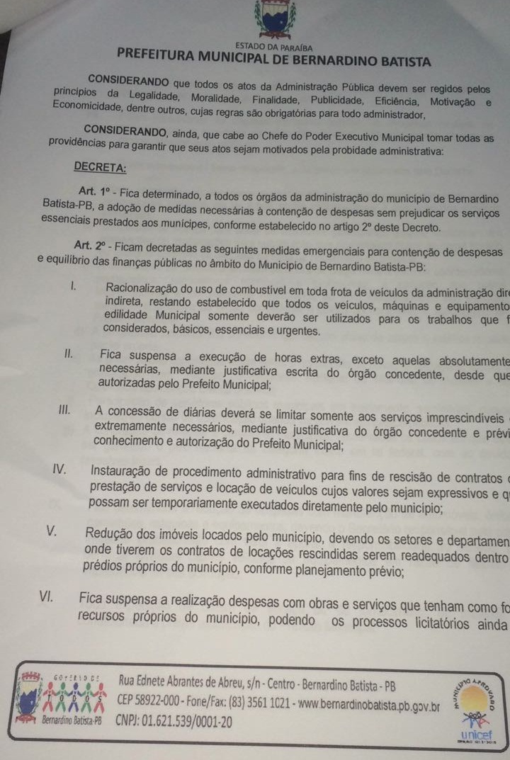 O decreto emergencial, em caráter temporário para adequação do município a crise econômica tem medidas que visam a economia.