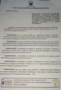 O prefeito de Bernardino Batista, Gervázio Gomes (PSB), participou nesse final de semana de uma reunião com o Sindicato dos Servidores Público do Município, onde, em assembleia com a classe baixou Decreto com várias medidas para contenção de gastos e despesas. O motivo é devido a crise financeira que atravessa os municípios brasileiros.