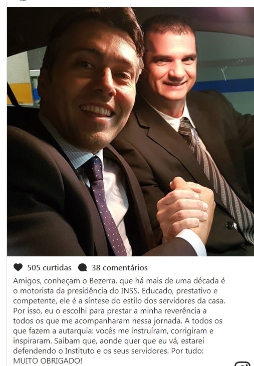 O sousense usou sua conta na rede social Instagram para se despedir do órgão. Ele postou uma foto com o motorista da presidência do INSS e agradeceu ao funcionário e a sua equipe de trabalho.
