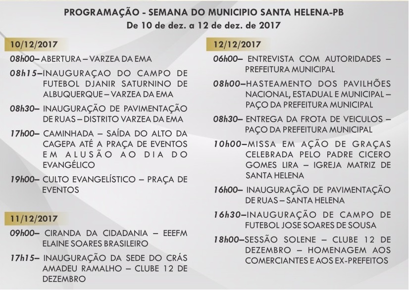 O prefeito da cidade de Santa Helena, Sertão da Paraíba, Emmanoel Messias (PSD) anunciou nesta quarta-feira (6), a programação oficial da semana da cidade. O município comemora nesse dia 12 de dezembro (terça-feira), 56 anos de emancipação política.