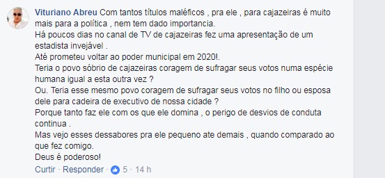 “Mas vejo esses dessabores (sic) pra ele pequeno até demais, quando comparado ao que fez comigo”, postou Vituriano de Abreu.