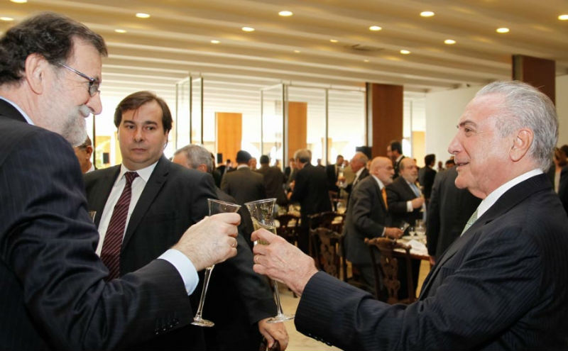 O primeiro-ministro de Portugal, António Costa (dir.), durante brinde em um jantar com o presidente Michel Temer (esq.); ao fundo, o então ministro José Serra (centro)