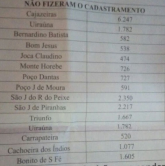 Concluídos os trabalhos de cadastramento biométrico dos eleitores no Estado da Paraíba, por parte do Tribunal Regional Eleitoral, 22.885 eleitores não compareceram aos pontos de atendimento na região do Alto Piranhas.