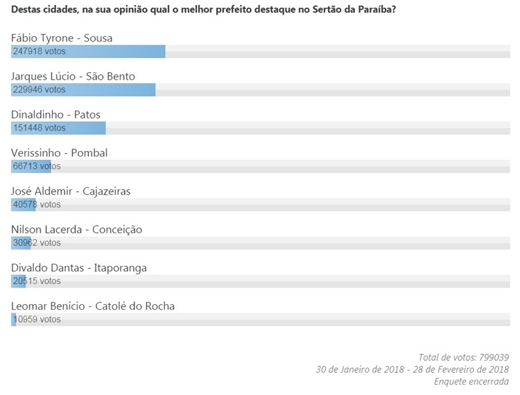 O Sistema Diário de Comunicação finalizou mais uma enquete, o internauta votou e escolheu qual o melhor prefeito destaque na região do Sertão da Paraíba. A enquete foi iniciada no dia 30 de janeiro deste ano e encerrada nesta quarta-feira, 28 de fevereiro recebendo no total, 799.039 mil votos e o gestor Fábio Tyrone (PSB) foi o primeiro colocado com 247.918 votos (31%).