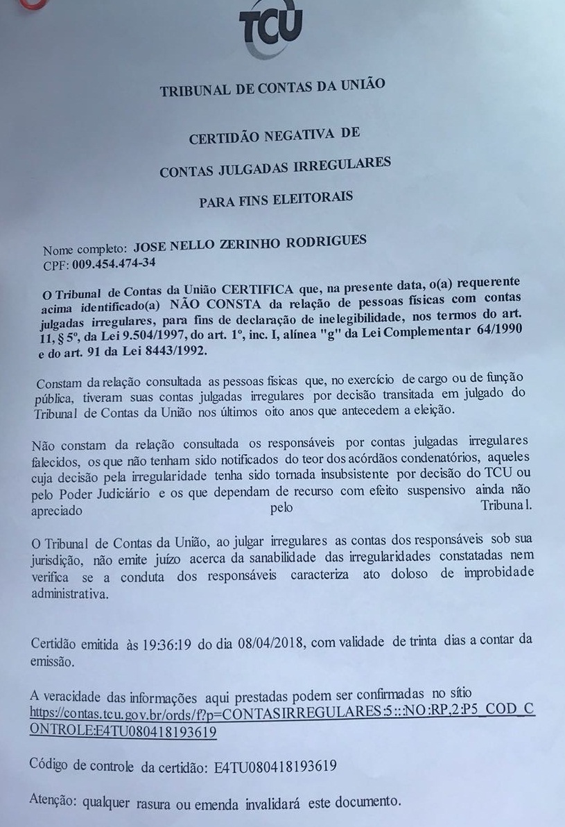 Zerinho apresentou uma certidão dando conta que nada consta de irregularidade na sua prestação de contas e contestou a informação do TCU: “Sou Ficha Limpa”.