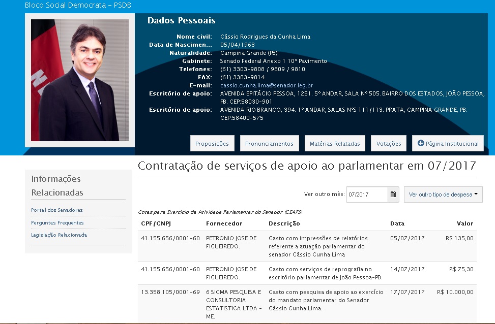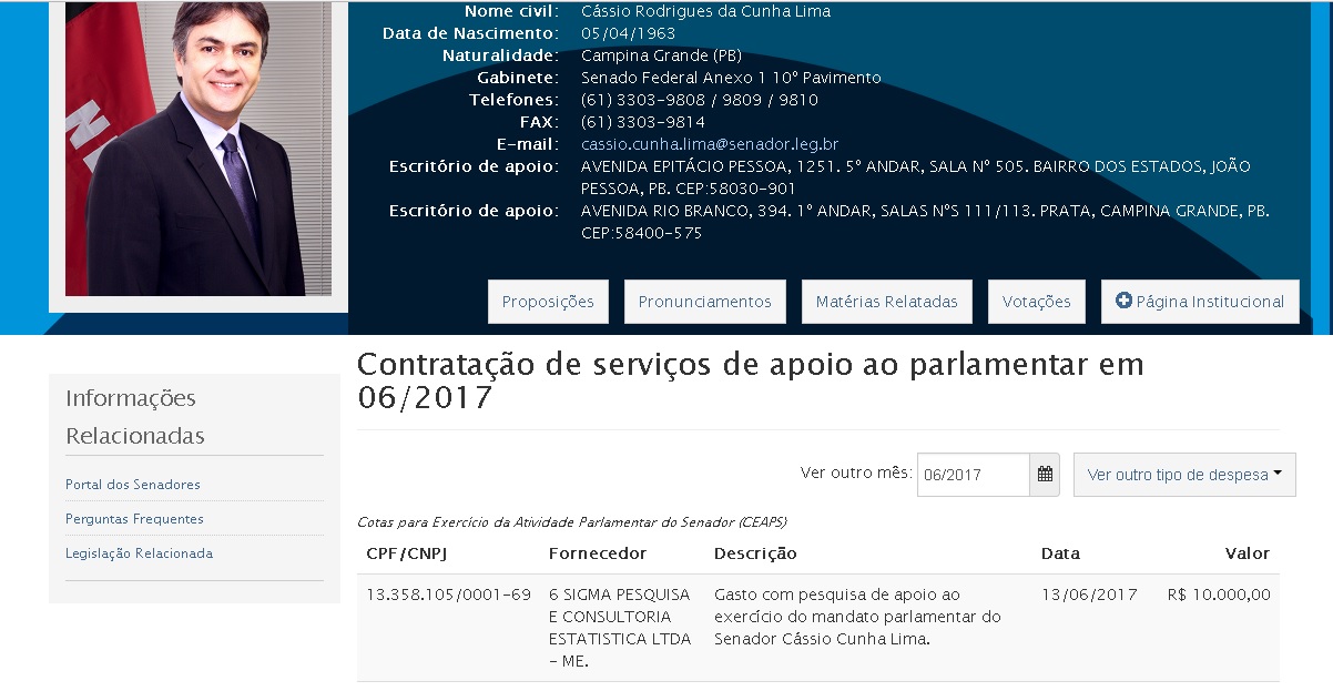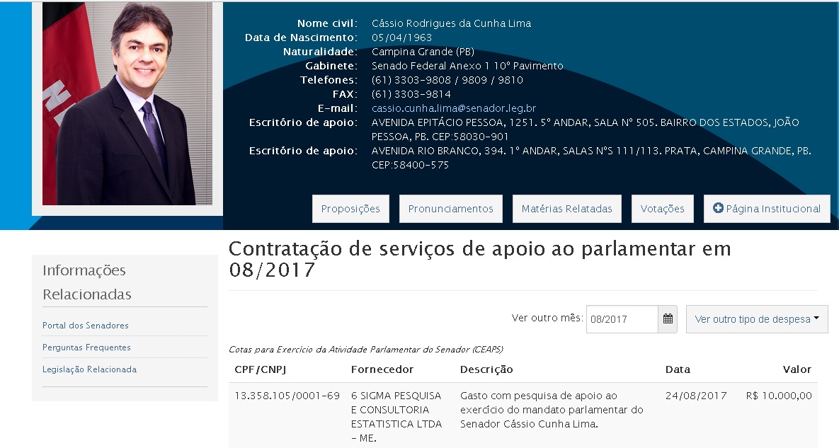 Levantamento publicado neste final de semana de semana pelo site G1, revela que o senador paraibano Cássio Cunha Lima (PSDB) aparece entre os três senadores que mais gastam dinheiro público, em 2017, com a contratação de consultorias e pesquisas. Dos R$ 3,9 milhões reembolsados pelos parlamentares neste quesito, Cássio foi responsável por R$ 174 mil dessa fatia. Um dado que vale ressaltar é que o instituto contratado por Cássio para tais aferições é o grupo 6 SIGMA PESQUISA E CONSULTORIA ESTATISTICA LTDA – ME.