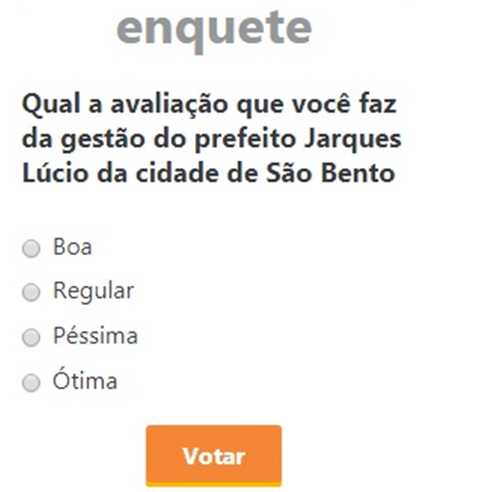 Veja as opções da enquete. Para avaliar a atuação do prefeito de São Bento basta entrar na página, no endereço www.diariodosertao.com.br/enquete, selecionar a opção desejada e clicar em votar.