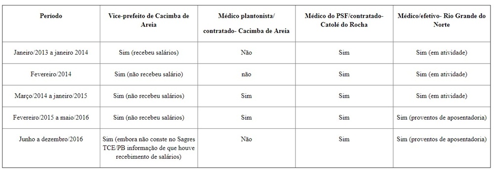 De acordo com a investigação, verificou-se que Francisco Félix Borges, no período de janeiro de 2013 até dezembro de 2016 acumulou irregularmente o cargo de vice-prefeito do Município de Cacimba de Areia com outros vínculos públicos de médico.
