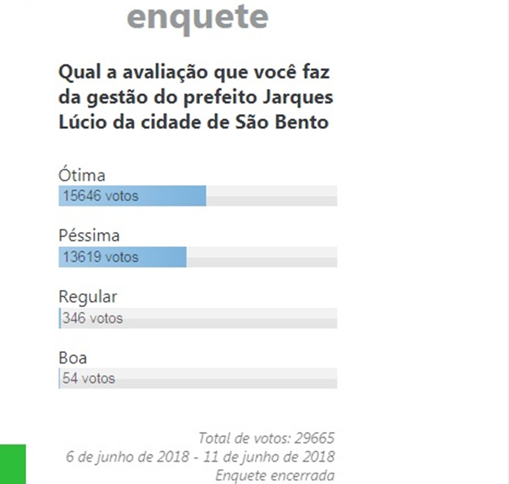 Foi encerrada nesse dia 11 de junho, a enquete realizada pelo Portal Diário do Sertão, para a avaliação da gestão dos 18 meses do prefeito de São Bento, Sertão da Paraíba, o médico Jarques Lúcio da Silva (PSDB).